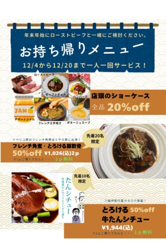 12/4よりお持ち帰りのローストビーフ食べ比べセットなどサービススタート!